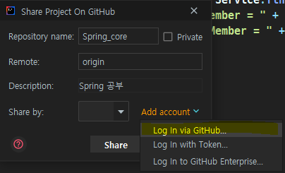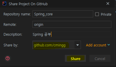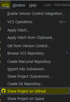 1. 해당 프로젝트 VCS -> Share Project on GitHub