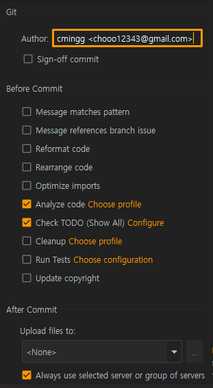 commit 메뉴에서 author 이메일을 작성해줘야한다